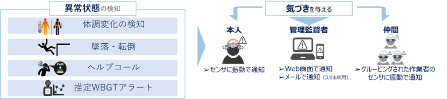 ・本人、グルーピングされた作業者へバイタルセンサが振動して気づきを与える