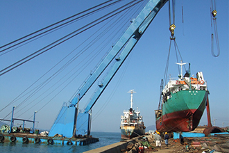 Miyaji Salvage is engaged in demolishing large vessels and processing resulted scrap into high quality steelmaking materials.